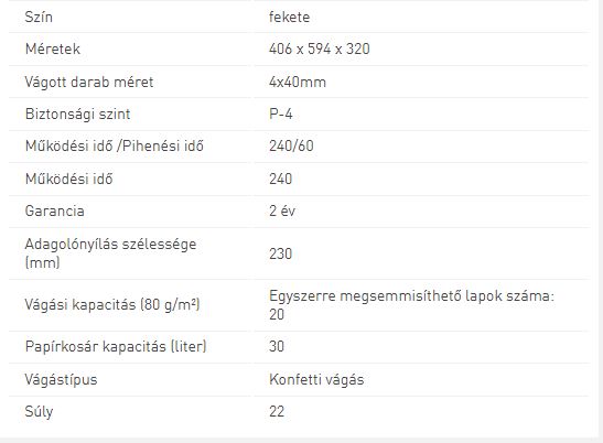 Egyszerre megsemmisíthető lapok száma: 20. Magas biztonsági fokozat: P4, konfetti vágás 4x40mm-es darabokra. Több papírt semmisít meg 240 perces folyamatos működési idővel. Elakadásmentes technológia, amely automatikusan leállítja a megsemmisítés folyamatát túl sok lap adagolása esetén. Könnyen megsemmisíti a többoldalas dokumentumot, a kapcsokat és a gémkapcsokat a papír sarkán. Intuitív kezelőfelület a könnyű használat érdekében. 30 literes hulladéktartály 275 db A4-es papír megsemmisítéséhez. Halk működés. 2 év garancia.
