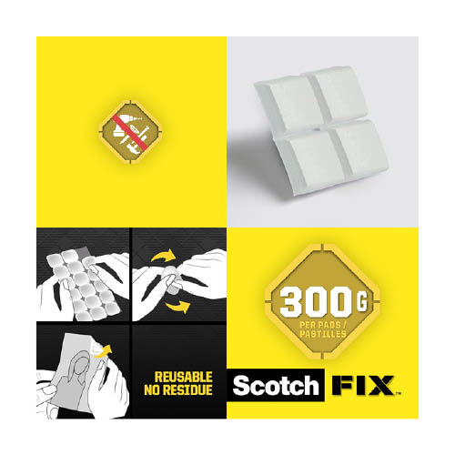 A Scotch-Fix™ eltávolítható tapadópárnák illeszkedő gittpárnák és nem hagynak maradványokat, ideálisak könnyűszerkezetek festett vagy tapéta felületekre történő Pl. papír, fénykép, plakát, kártya és egyebek felszereléséhez. Ezek az akár 300g teherbírású eltávolítható tapadópárnák különféle porózus és nem porózus felületekre is tökéletesen tapadnak. Nincs több fúrás, nincs szükség szerszámra, rögzítésre és eltávolításra. Használja rajzszeg helyett, hogy megőrizze felületei nagyszerű megjelenését!