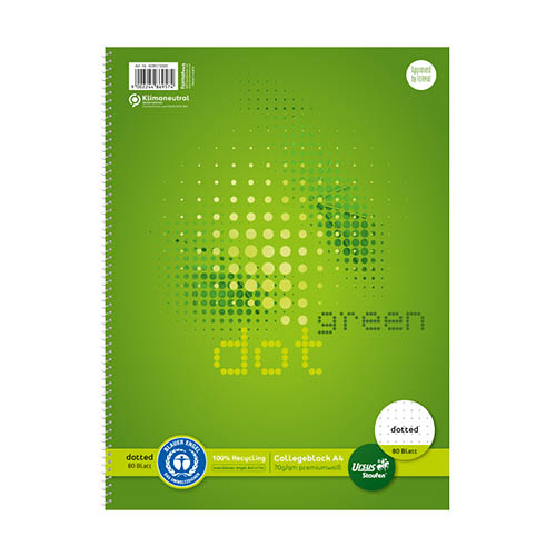 Kiváló minőségű, 70 g-os papírból készült, 80 lapos, ponthálós spirálfüzet, 100%-ig újrahasznosított. A prémium minőségű fehér lapok opikai fehérítő nélküliek és klórmentesek. A termék Blue Angel, Osztrák ÖKO címkével és Nordi Swan tanúsítvánnyal is rendelkezik. A gyártási folyamat TÜV által ellenőrzött. Ez az osztrák minőségi termék 100%-ban éghajlat semleges és környzetbarát. Perforált és lyukasztott.