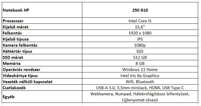 A HP 250 G10 laptop alapvető üzleti funkciókat kínál, minden körülmények között egyszerű hordozhatóságot biztosító vékony és könnyű kivitelben. A 15,6 hüvelykes képátlójú, 85 százalékos képernyő–test arányú kijelző, a nagy teljesítményű Intel® processzor, a gyors memória és a tárhely a termelékenységet, a beépített portok pedig a perifériaeszközök csatlakoztatását segítik elő – mindezt rendkívül kedvező áron.